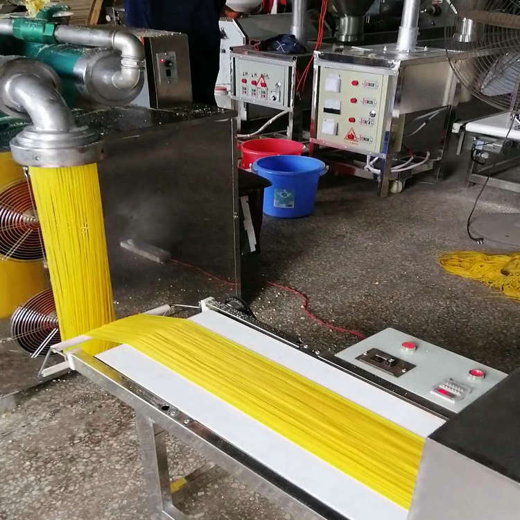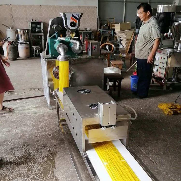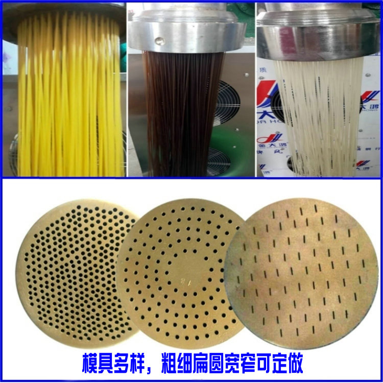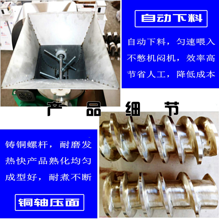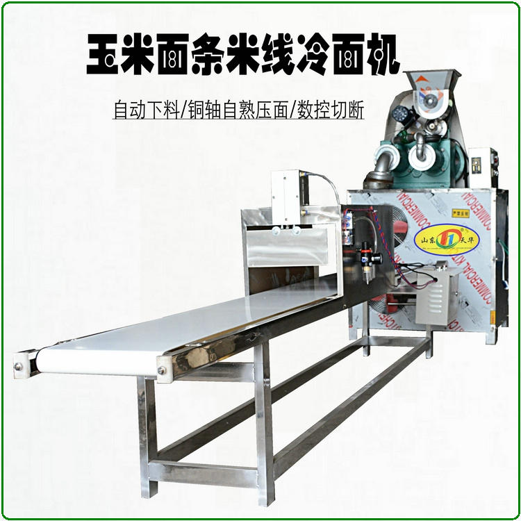 天華自熟冷面機(牛筋面機)結構合理,造型美觀,由自動下料器、雙銅軸壓面機、數(shù)控切斷機組成,自動下料器由調速電機帶動,通過快慢速度調整喂料的多少,壓面機采用螺旋擠壓生物變性工藝,無需外加熱源,利用軸筒旋轉與原料摩擦揉擠產生的熱能,使原料到成品一次熟化成型,將玉米面、蕎麥面、小麥面等雜糧面通過冷面機綜合轉化成具有柔韌彈性特點的風味面食,更換不同的的模具可以加工不同粗細寬窄的形狀,產品外表光滑、柔軟可口、久煮不糊,保留原糧的特有營養(yǎng)成分和微量元素。自熟冷面機還可生產鋼絲面、牛筋面及各種雜糧面條等。成型的面食進入調速皮帶輸送機,由延時控制切斷裝置把面條切成所需的長短后即可包裝銷售。